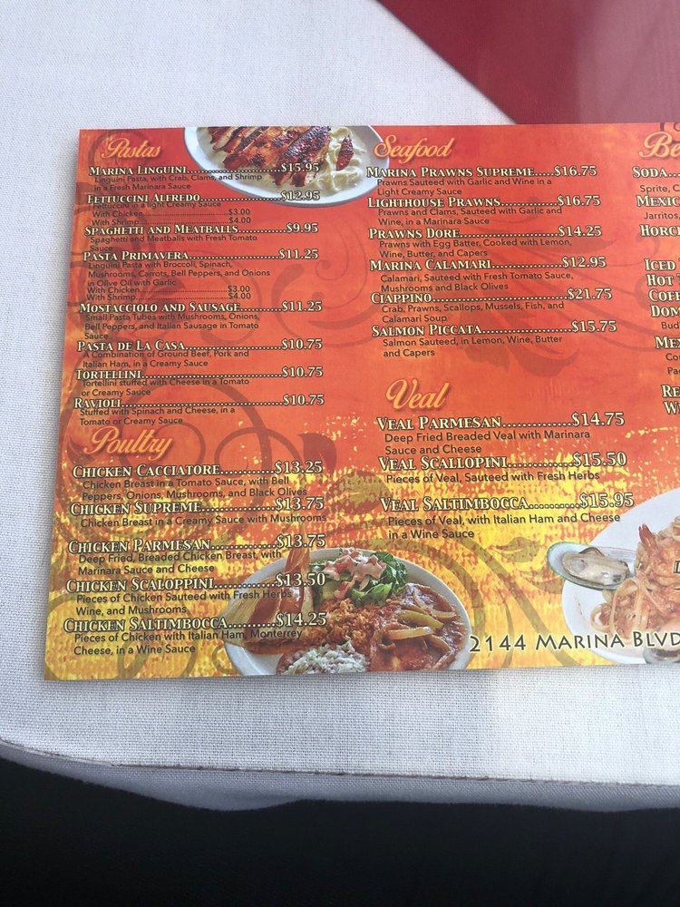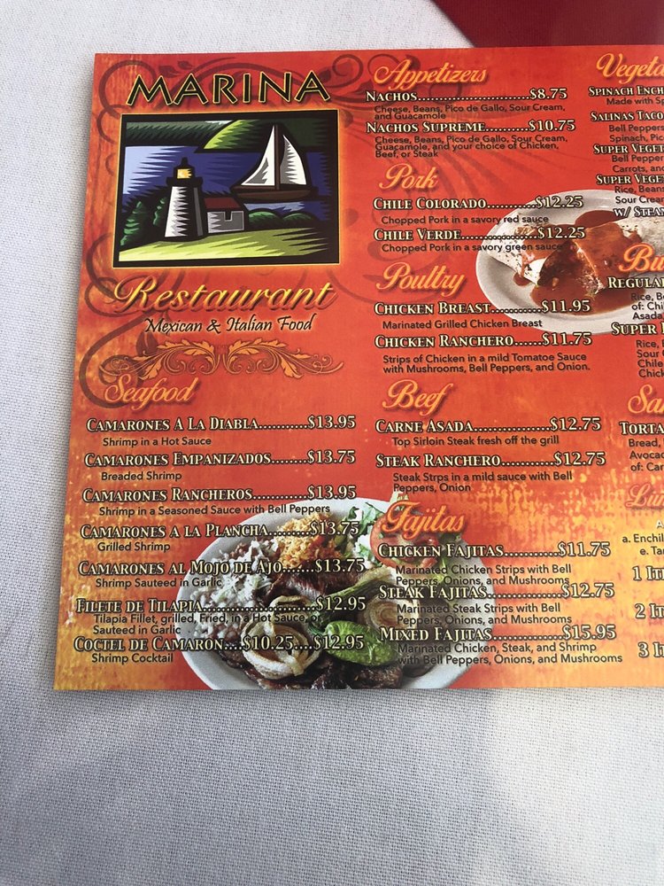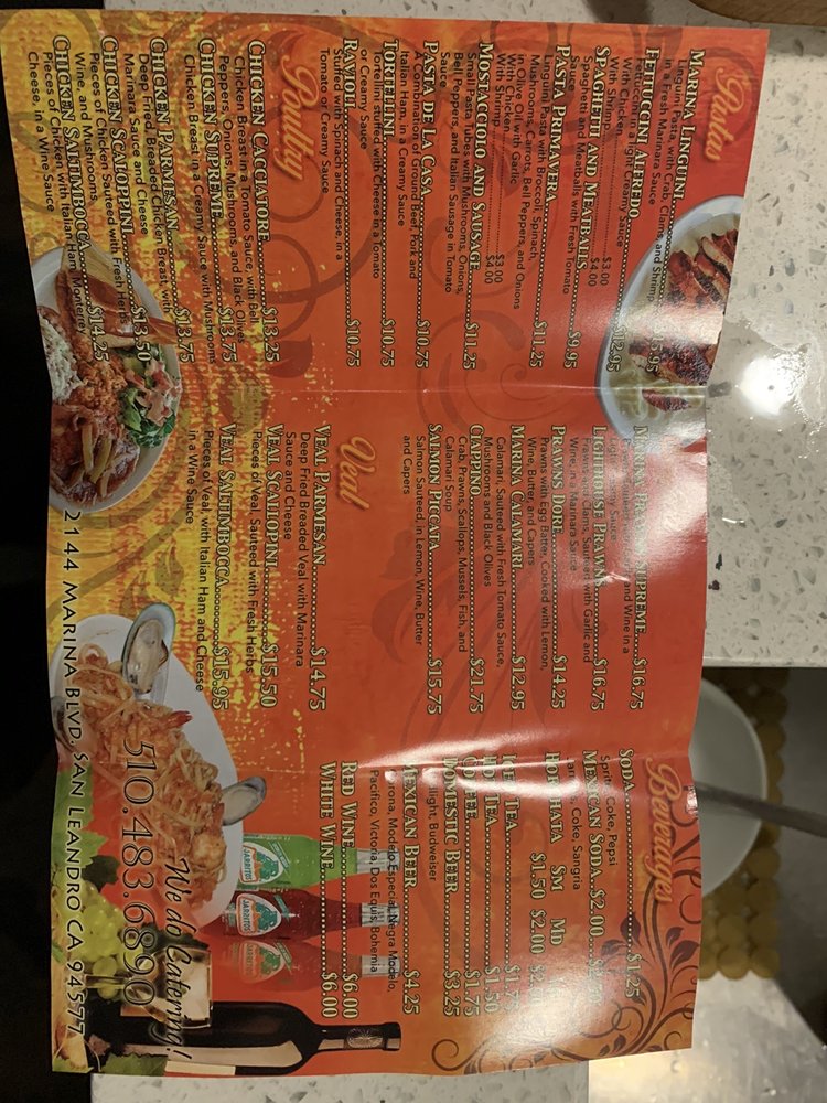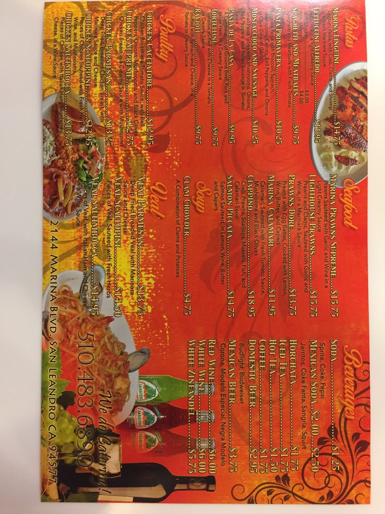 Marina Restaurant, located in San Leandro, CA, is a delightful blend of Italian and Mexican cuisine. This charming, mom-and-pop restaurant offers a cozy ambiance reminiscent of dining at home. The menu features a variety of house specials, like the Super Burrito and Chicken Fajitas, along with vegetarian options like Spinach Enchiladas. Customers rave about the delicious food and generous portions, with favorites including the Chicken Alfredo and Torta. The owners are friendly and welcoming, creating a warm atmosphere for patrons. With excellent service, reasonable prices, and a mix of flavorful dishes, Marina Restaurant is a hidden gem worth visiting. Whether you're in the mood for Italian pasta or Mexican burritos, Marina Restaurant has something for everyone to enjoy.